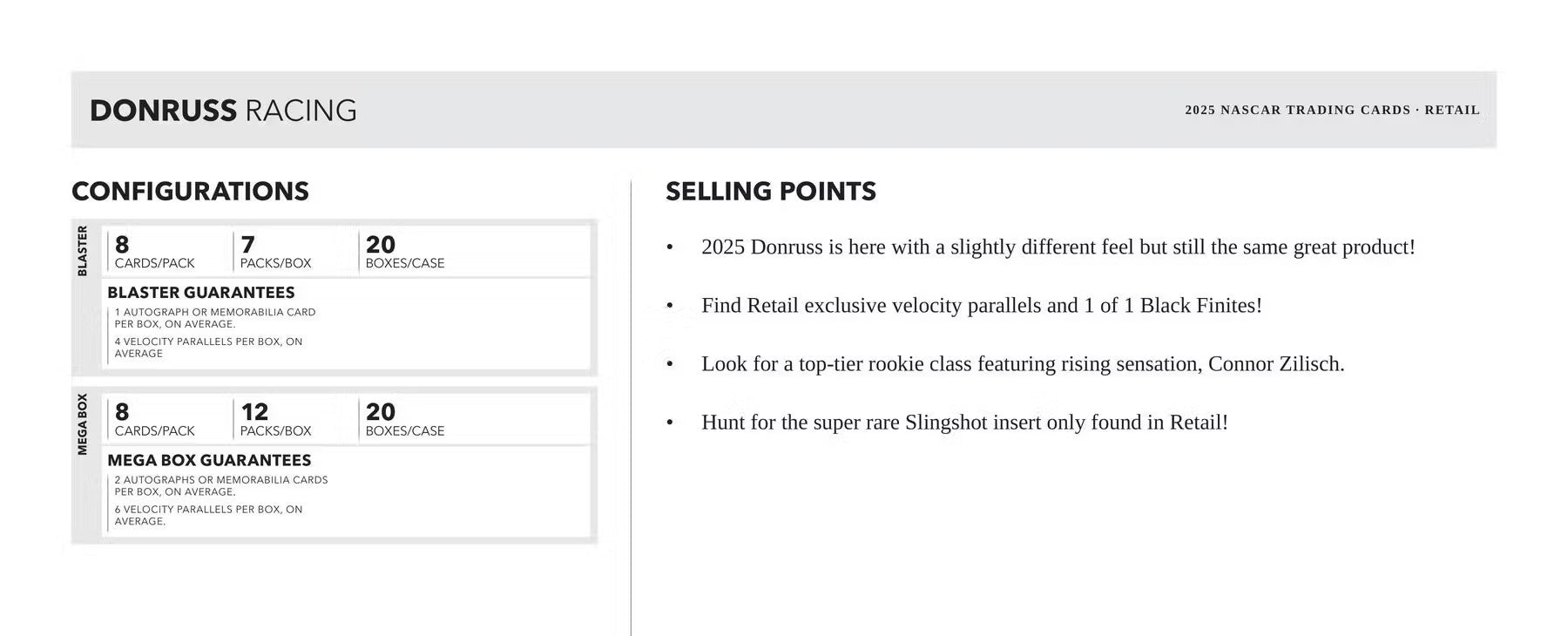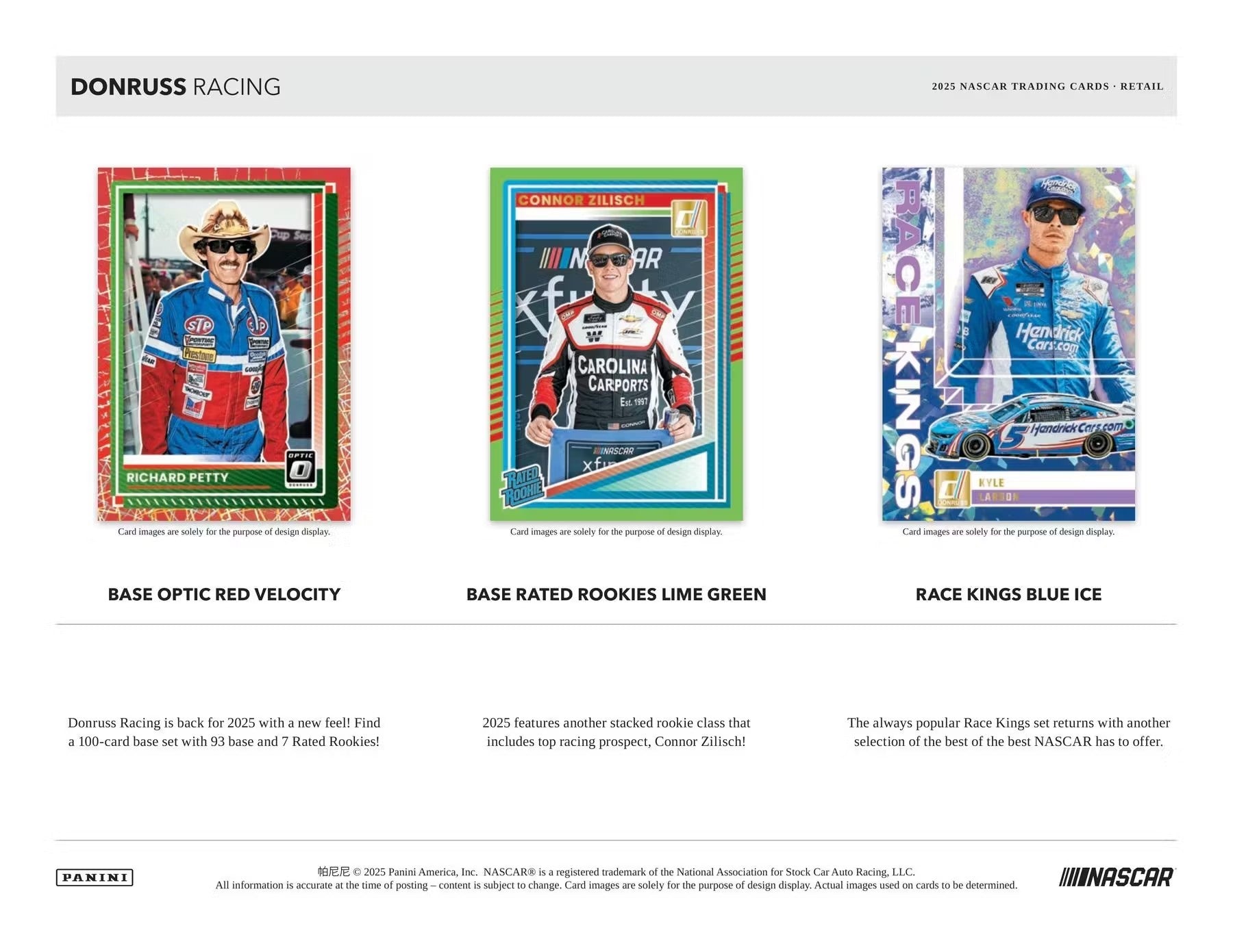 Donruss Racing is back for 2025 with a new feel! Find a 100-card base set with 93 base and 7 Rated Rookies!