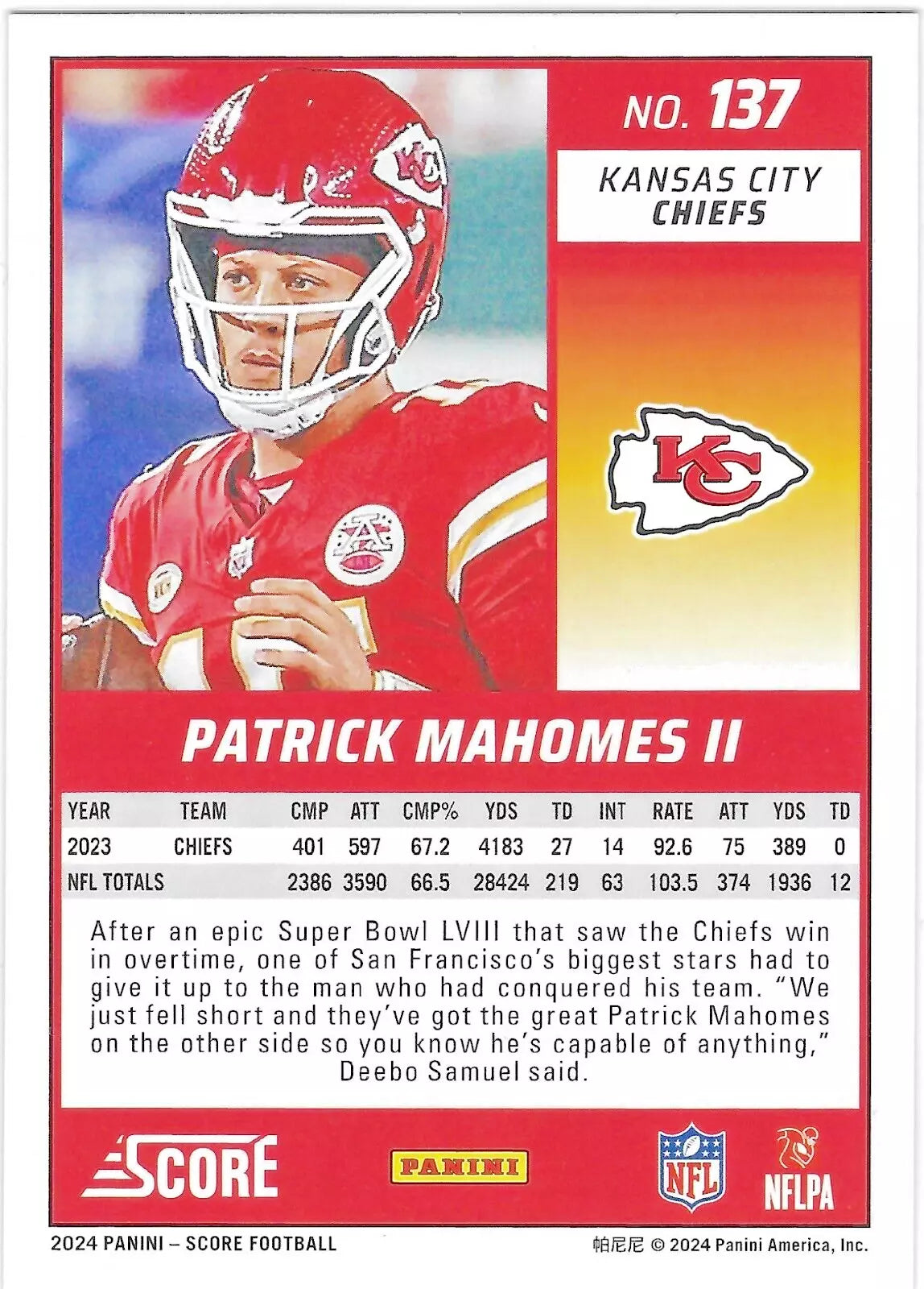 Patrick Mahomes II 2024 Score Green Series Mint Card #137 picturing this Kansas City Chiefs superstar in his Red jersey.