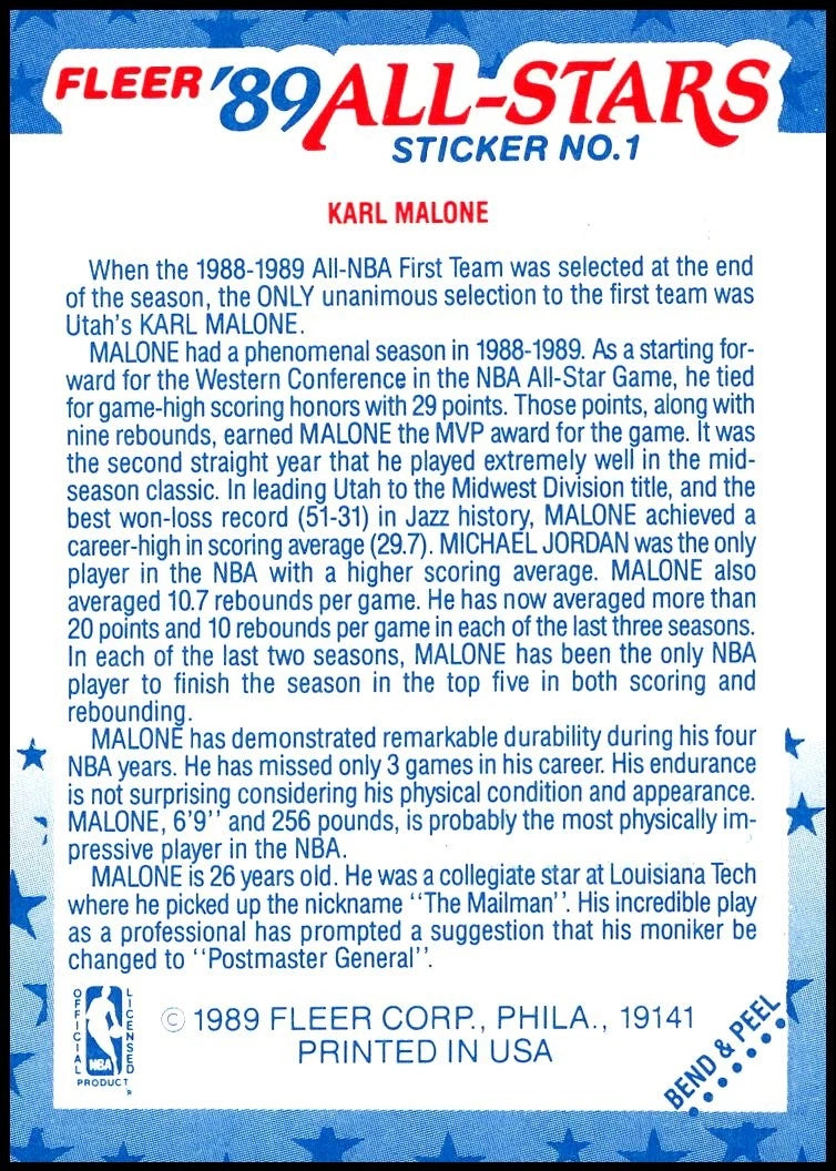 Karl Malone 1989 1990 Fleer Sticker Series Mint Card #1