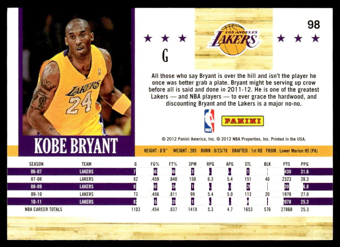 Kobe Bryant 2011 2012 Hoops Basketball Series Mint Card #98