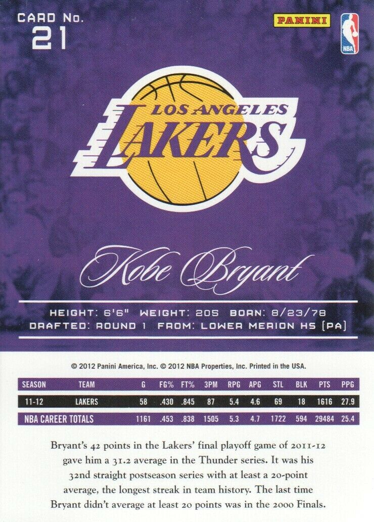 - Kobe Bryant 2012 2013 Panini Prestige Basketball Series Mint Card #21 Showing This Los Angeles Lakers Star in His White Jersey