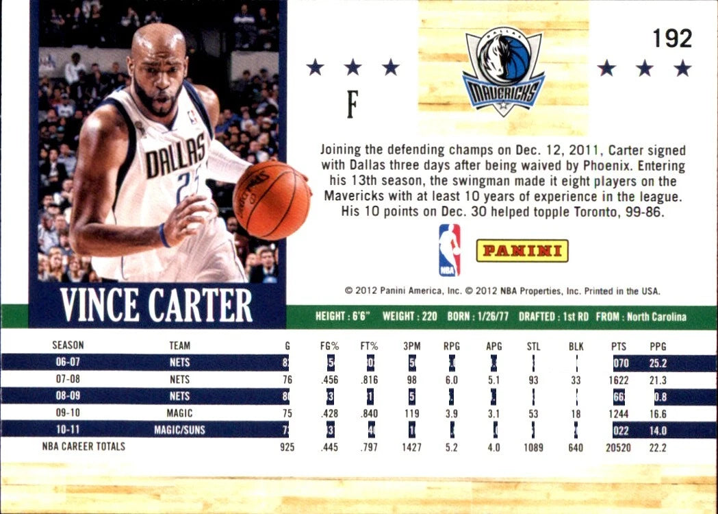 Vince Carter 2011 2012 Panini Hoops Series Mint Card #192