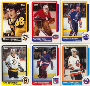 This is a 1986 / 1987 Topps Hockey series complete mint 198 card set Loaded with stars including Patrick Roy's rookie card, Mario Lemieux, Steve Yzerman, Wayne Gretzky, Ray Bourque, John Vanbiesbrouck's rookie card, Doug Gilmour, Al Macinnis, Mark Messier, Paul Coffey, Wendel Clark's rookie card, Scott Stevens, Mike Bossy and many others. Hard set to find!