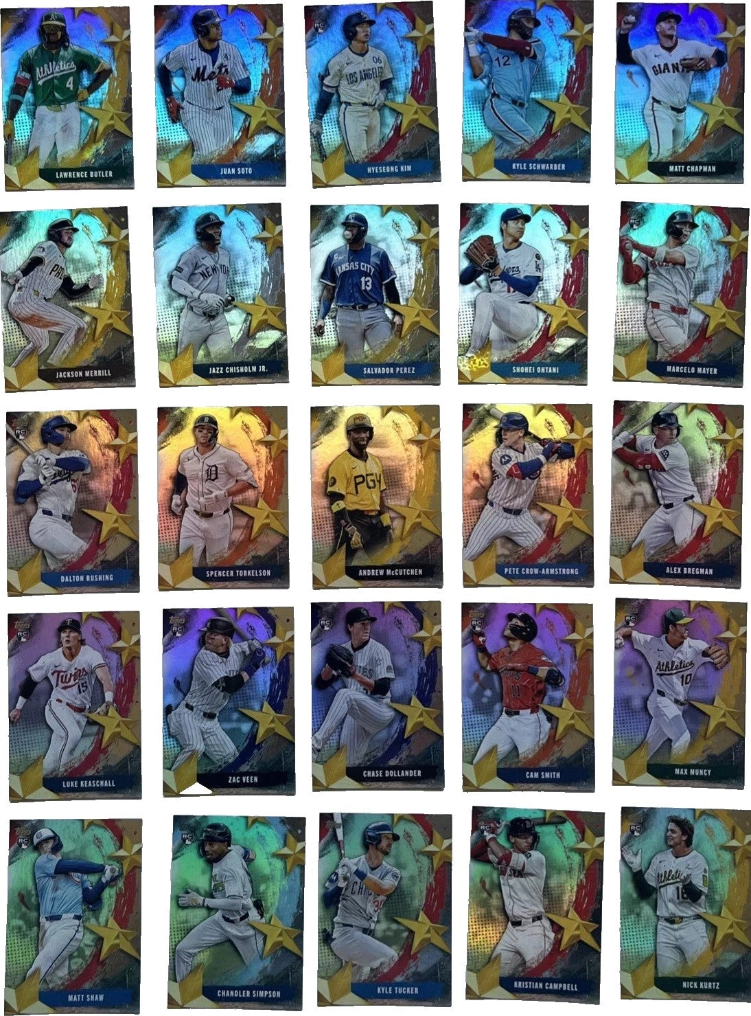 This is the 2025 Topps Stars of MLB Update Series complete mint 25 card insert set. Cards are numbered SMLB #61-85. Loaded with Stars and Key Rookie cards including Nick Kurtz, Kristian Campbell, Cam Smith, Alex Bregman, Pete Crow-Armstrong, Dalton Rushing, Shohei Ohtani, Salvador Perez, Jackson Merrill, Kyle Schwarber, Hyeseong Kim, Juan Soto and more!