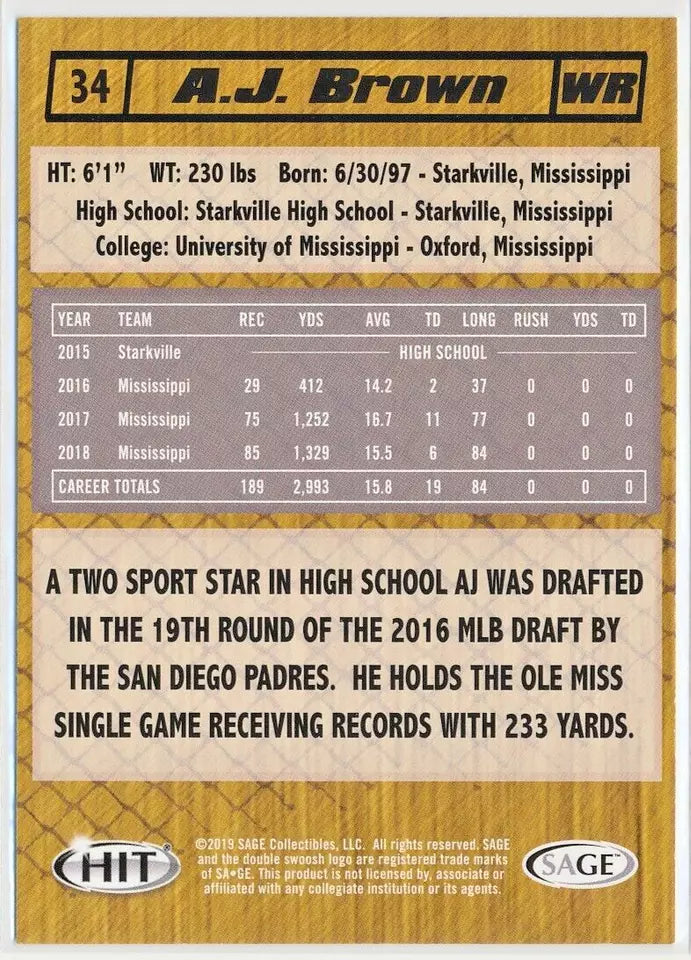A.J. Brown 2019 SAGE HIT Series Mint Card #34