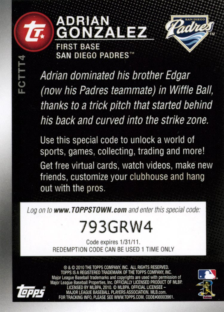 Adrian Gonzalez 2010 Topps Toppstown Gold Code Card Series Mint Card #FCTTT4