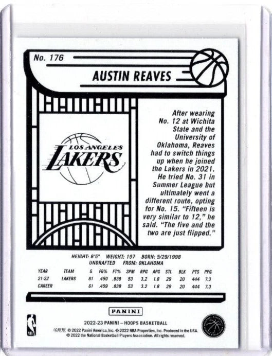 Austin Reaves 2022 2023 Panini Hoops Blue Series Mint Card #176 picturing him in his Gold Lakers Jersey.