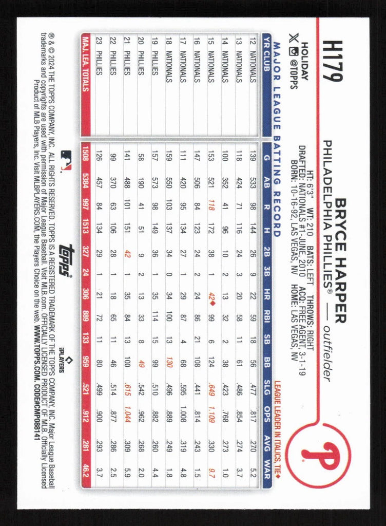 Bryce Harper 2024 Topps Holiday Series Mint Card #H179