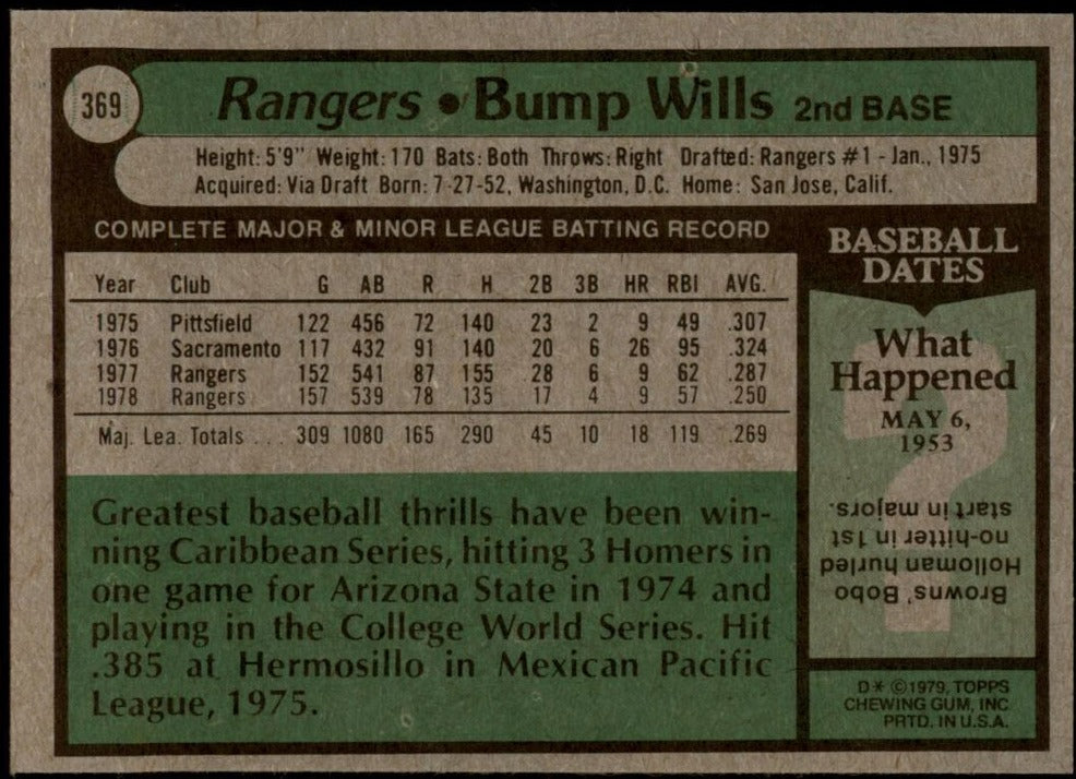 Bump Wills 1979 Topps Blue Jays ERROR VARIATION Series Card #369