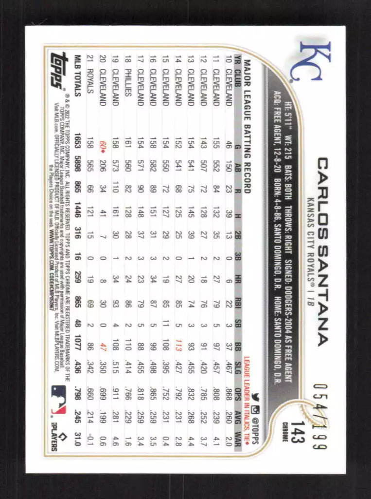 Carlos Santana 2022 Topps Chrome Aqua Mini-Diamond Refractor Series Mint Card #143 Only 199 Made!   Serial #150/199.