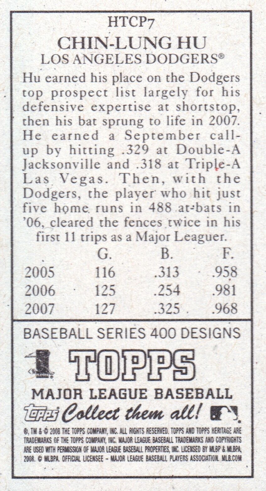 Chin-Lung Hu 2008 Topps Heritage T205 Mini Series Mint Card #HTCP7