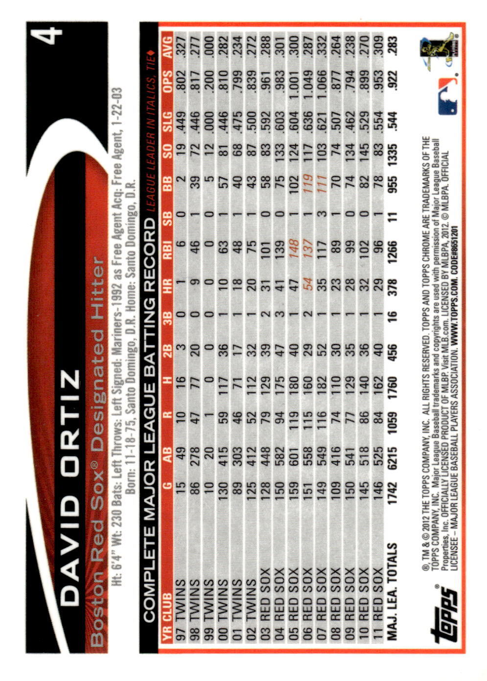 David Ortiz 2012 Topps Chrome Series Mint Card #4