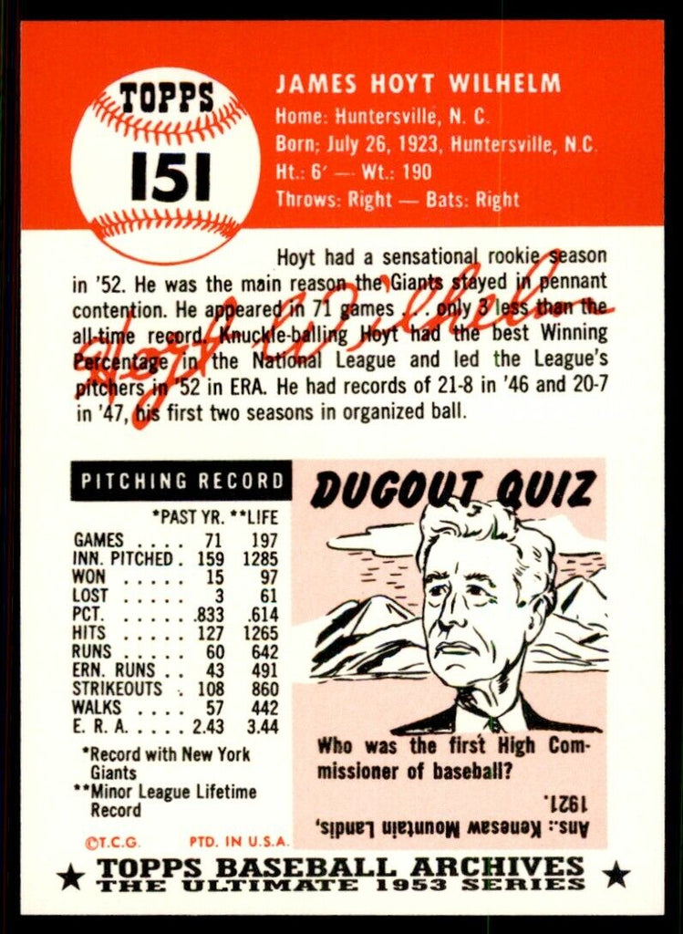 Hoyt Wilhelm 1991 Topps 1953 Archives Series Mint Card #151