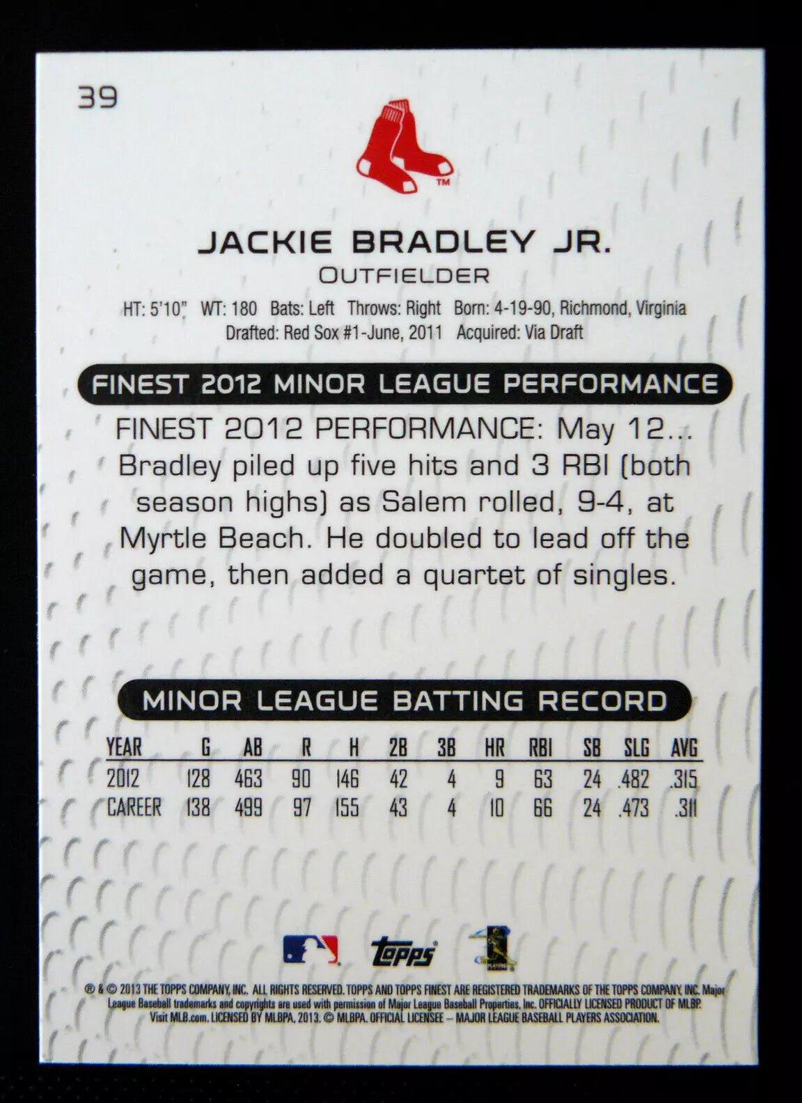 Jackie Bradley Jr. 2013 Topps Finest Series Mint Card #39