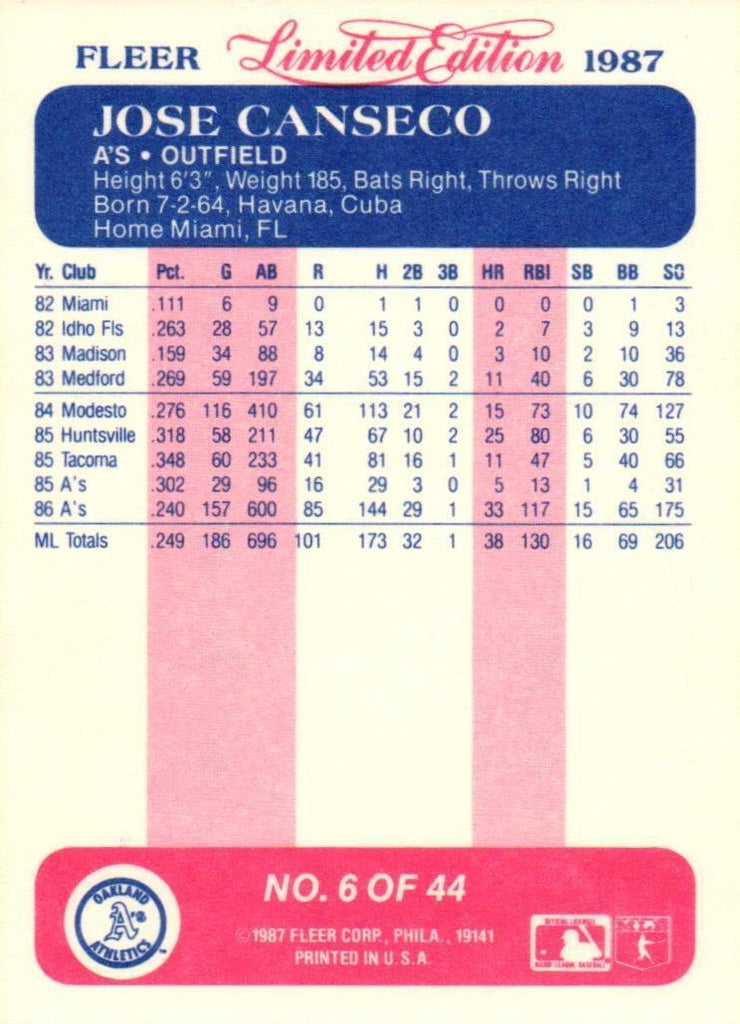 Jose Canseco 1987 Fleer Limited Edition Series Card #6