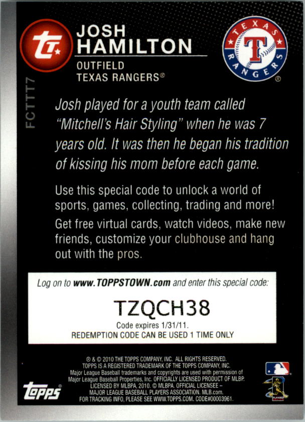 Josh Hamilton 2010 Topps Toppstown Gold Code Card Series Mint Card #FCTTT7