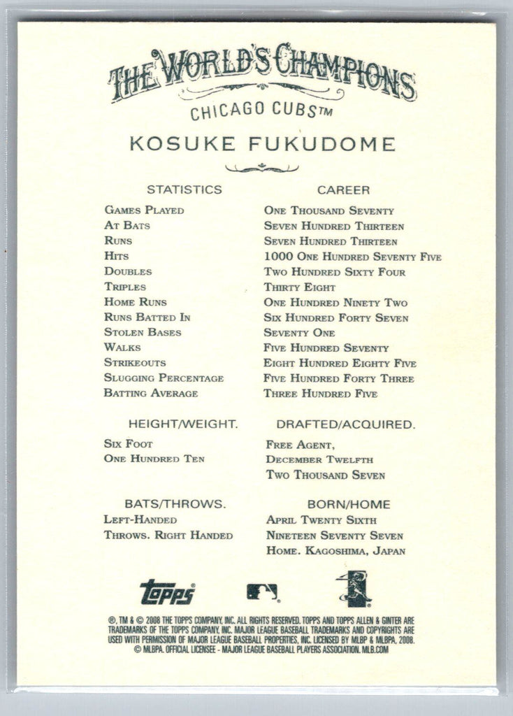 Kosuke Fukudome 2008 Topps Allen & Ginter Series Mint Rookie Card NO NUMBER