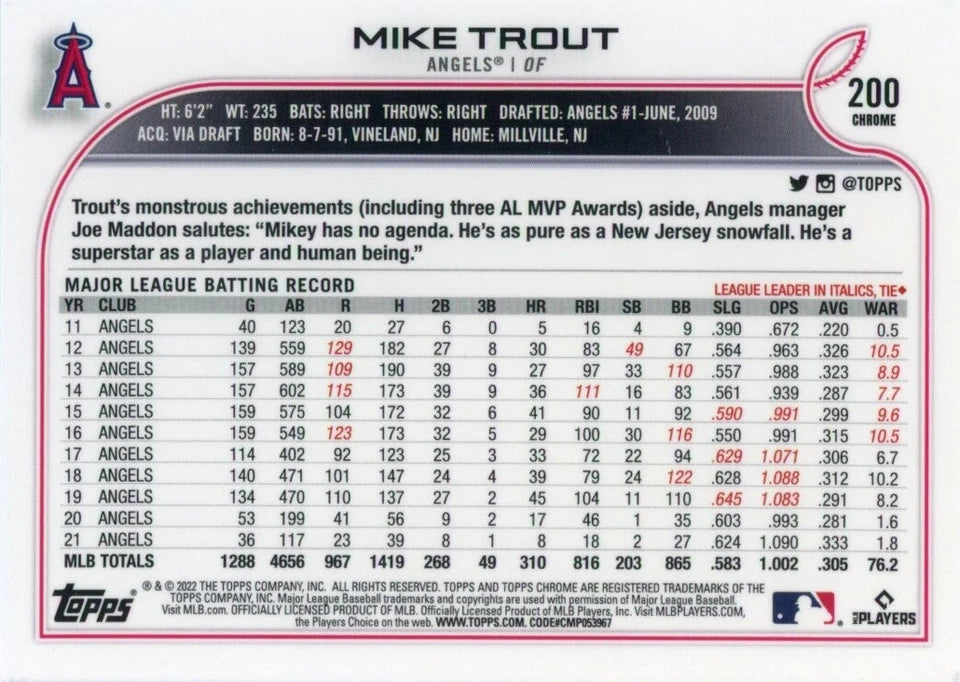 Mike Trout 2022 Topps Chrome Series Mint Card #200