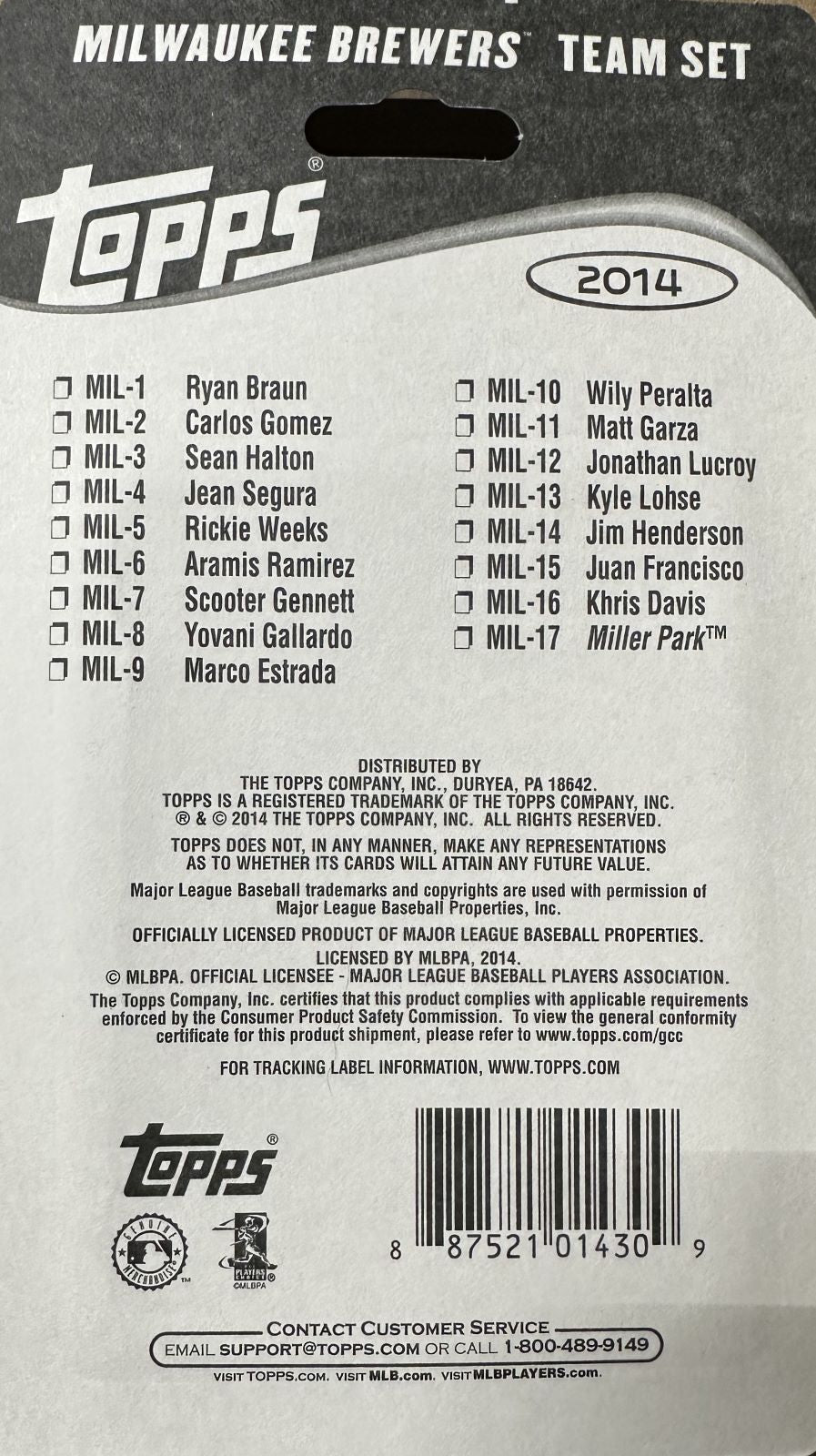 This is a 2014 Topps Milwaukee Brewers Factory sealed special edition 17 card team set; cards are numbered MIL-1 through MIL-17 and are not available in packs. Players included are Ryan Braun, Aramis Ramirez, Carlos Gomez, Sean Halton, Jean Segura, Rickie Weeks, Scooter Gennett, Yovani Gallardo, Marco Estrada, Wily Peralta, Matt Garza, Jonathan Lucroy, Kyle Lohse, Jim Henderson, Juan Francisco, Khris Davis and Miller Park.