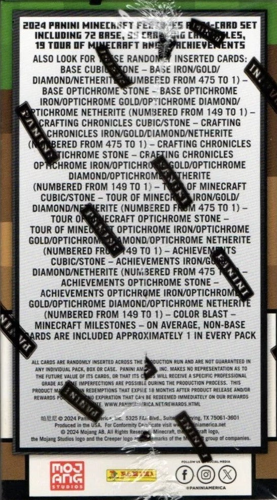 The official Minecraft Trading Card collection features over 200 cards from the influential and iconic game, including characters, mobs, and biomes. Find limited-edition parallels - Stone, Iron, Gold, Diamond, Netherite - as well as optichrome versions. Look for ultra-rare Color Blast and Minecraft Milestone cards. Collect and trade unique cards from the creative and expansive Minecraft universe. Unleash the excitement of the 2024 Minecraft Trading Card series with this Panini blaster box. It's a treasure trove for collectors and fans alike, featuring the iconic Creeper character and crafted from quality card stock. Each box contains 36 standard-sized cards, offering a substantial addition to any collection.The box is manufactured in the United States and designed specifically for the non-sport trading card enthusiast. It presents a unique opportunity to own a piece of the Minecraft franchise, with each card capturing the essence of the popular video game. This English-language set is a must-have for aficionados of the series and collectors of unique memorabilia.