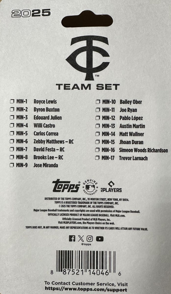 Minnesota Twins 2025 Topps Factory Sealed 17 Card Team Set Featuring Royce Lewis, Byron Buxton and Carlos Correa with Rookie cards of Zebby Matthews, David Festa and Brooks Lee Plus