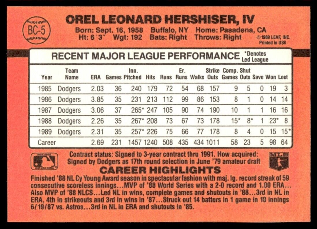 Orel Hershiser 1990 Donruss MVP Series Mint Card #BC5