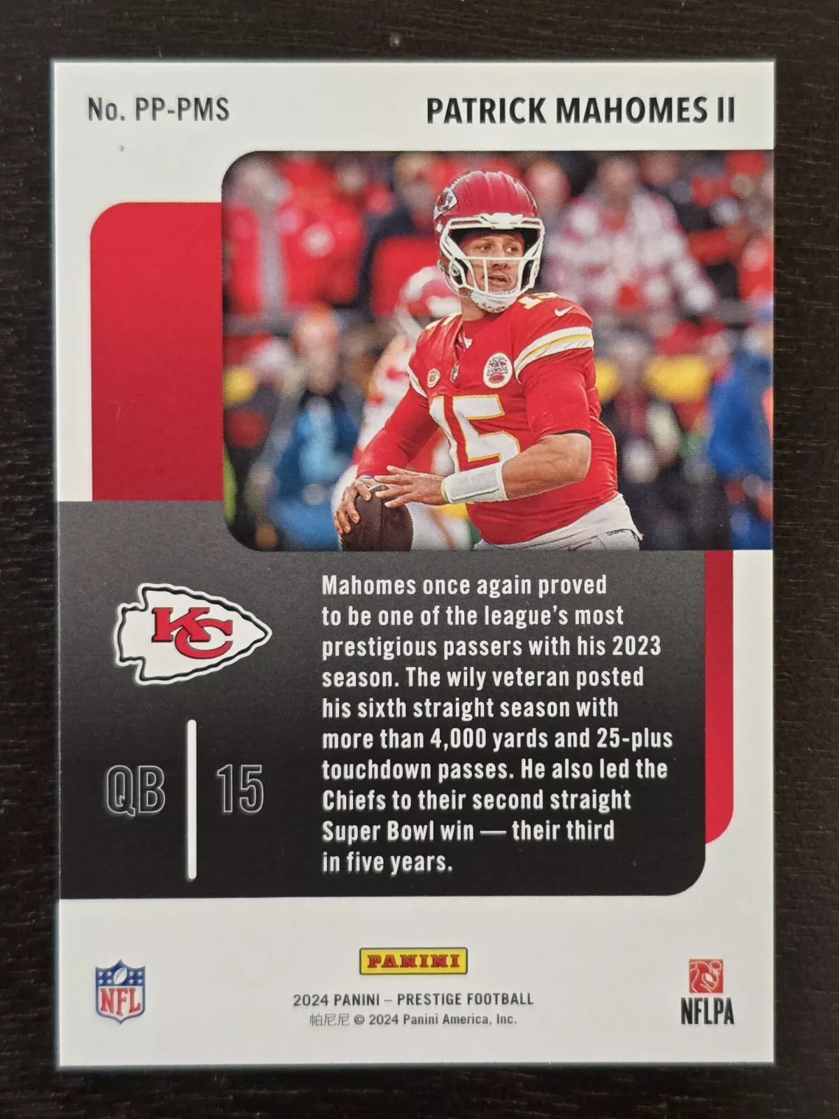 Patrick Mahomes II 2024 Panini Prestige Prestigious Pros Series Mint Card #PP-PMS picturing this Kansas City Chiefs Superstar in his Red jersey.