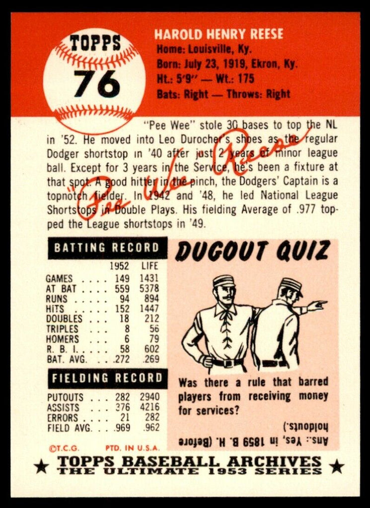 Pee Wee Reese 1991 Topps 1953 Archives Series Mint Card #76