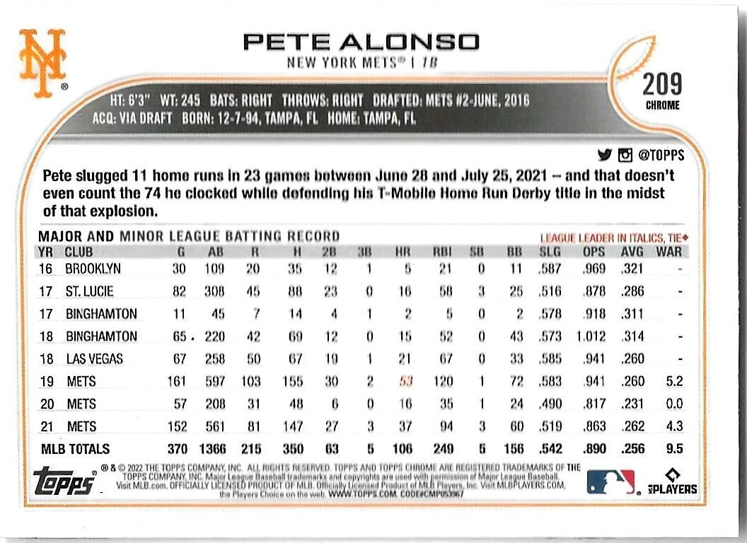 Pete Alonso 2022 Topps Chrome Series Mint Card #209