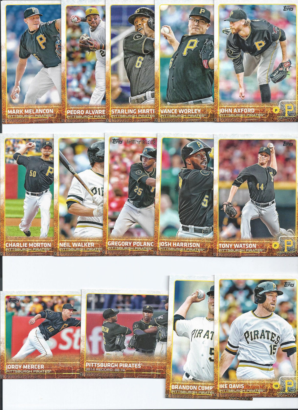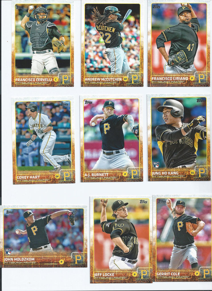 This is a 2015 Topps Pittsburgh Pirates complete mint 23 card team set; it was never issued in factory form. All Pirates cards from series #1 and #2 including Andrew McCutchen, Gerrit Cole, Jeff Locke, John Holdzkom, Corey Hart, A.J. Burnett, Jung Ho Kang, Francisco Cervelli, Francisco Liriano, Brandon Cumpton, Ike Davis, Charlie Morton, Neil Walker, Jordy Mercer, Gregory Polanco, Josh Harrison, Tony Watson, Mark Melancon, Pedro Alvarez, Starling Marte, Vance Worley, John Axford and a 2014 Pirates Team Standings Card.