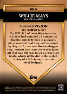 Willie Mays 2012 Topps Golden Greats Series Mint Card #GG12